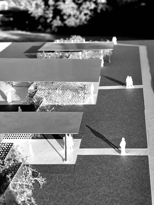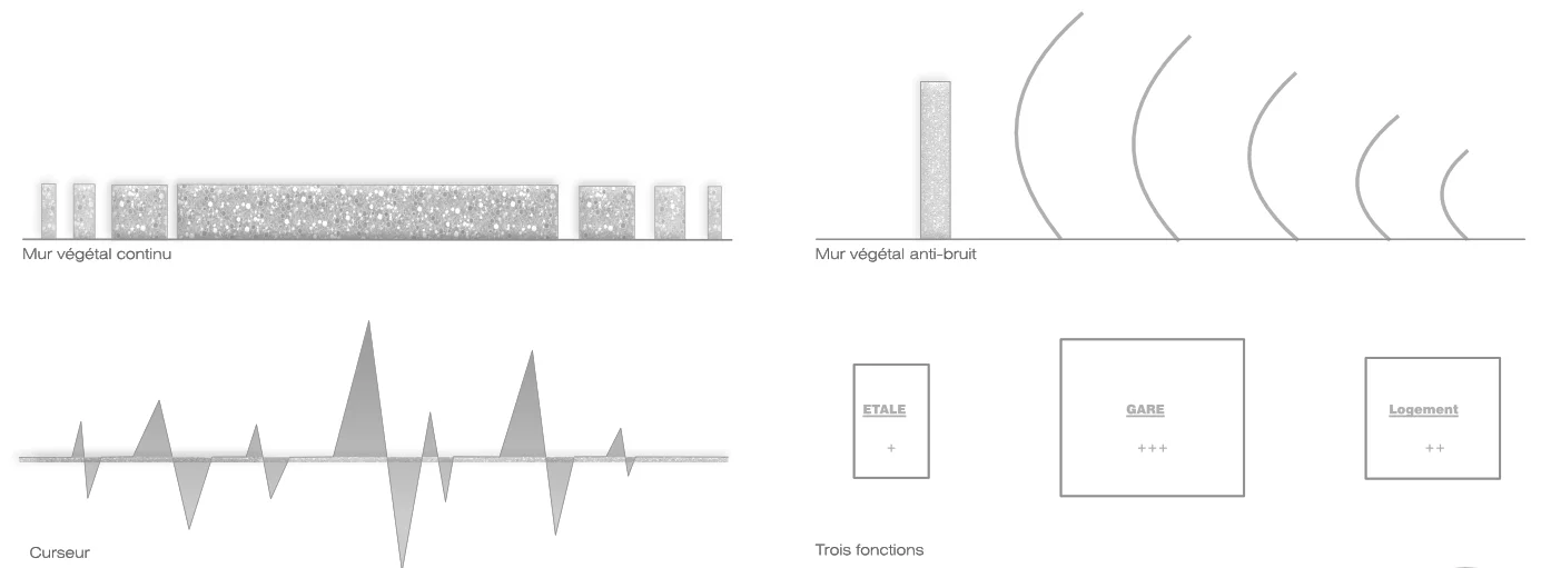Implantée face à la place centrale, elle favorise les échanges et l’accessibilité, tandis que son organisation horizontale simplifie les flux et renforce le lien avec l’espace public. Plus qu’un pôle de transport, elle rassemble trois fonctions : gare, petit commerce et logement, afin de répondre à des besoins locaux et de revitaliser le site. Un mur végétal anti-bruit traverse l’ensemble et structure la composition : il protège les riverains, crée une continuité spatiale entre les différentes parties et devient un support de biodiversité. Par sa simplicité constructive, sa lisibilité et son ouverture, le projet propose une architecture accueillante et inclusive, créant un lieu de vie qui renforce les connexions sociales tout en valorisant le paysage.