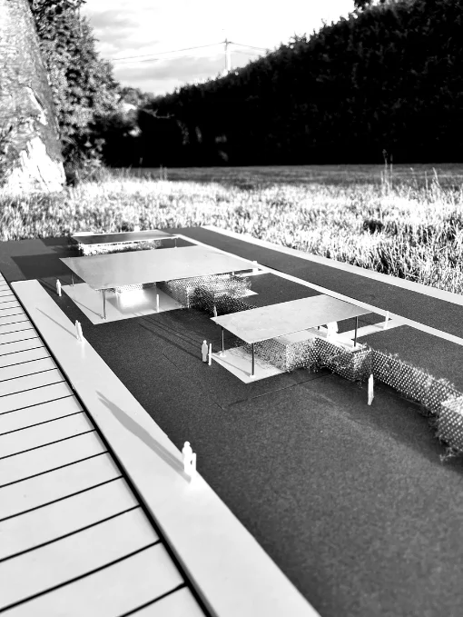 La gare imaginée à Cheratte s’inscrit avec une forme d’humilité dans son contexte : ses volumes bas, alignés aux maisons ouvrières, préservent les vues vers les coteaux et respectent le rythme des pleins et des vides du quartier.