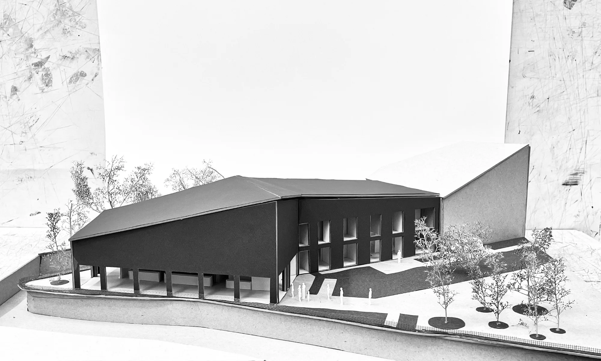Le programme articule des espaces publics accessibles (accueil, café, théâtre) et des espaces privés discrets, reliés par des zones intermédiaires pensées pour assurer une transition lisible. Un logement d’artiste polyvalent s’ajoute à cet ensemble hybride, tout en préservant l’intimité nécessaire. Ancré dans une démarche responsable, le projet valorise les ressources locales et le réemploi : structure en bois, parement en briques, récupération des briques concassées des garages démolis pour former les cheminements, et mobilier extérieur sculpté dans la pierre porphyre caractéristique de la région.