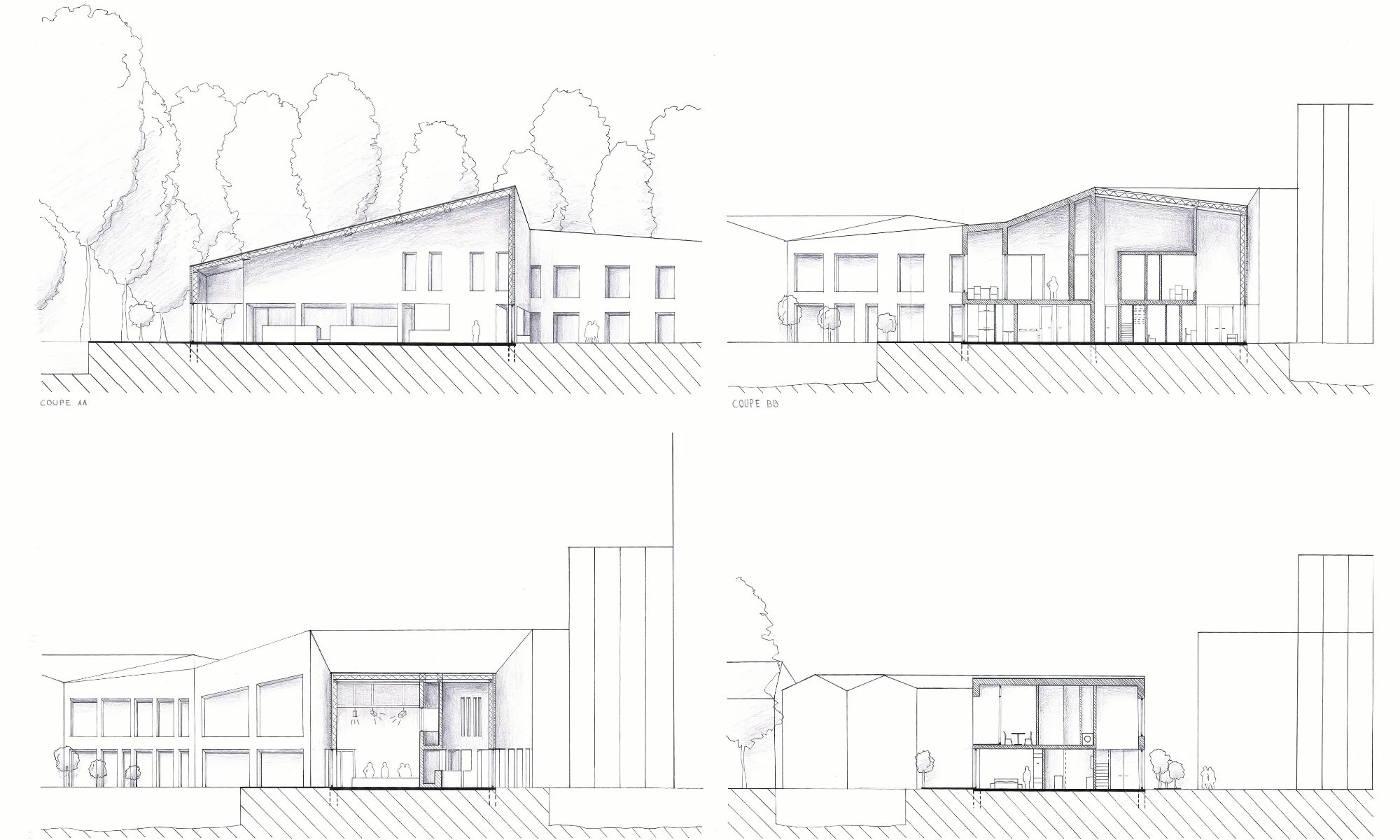 Situé à proximité de la gare et posé sur une pointe entre deux cours d’eau, le bâtiment bénéficie d’une ouverture vers l’extérieur, renforcée par une orientation plein sud et par des baies vitrées positionnées à hauteur humaine. Son intégration s’appuie sur l’étude attentive de la skyline du site à Lessine, déterminant le dessin des toitures. Une entrée est clairement identifiable et facilite l’accueil du public en affirme le rôle du projet dans la ville.