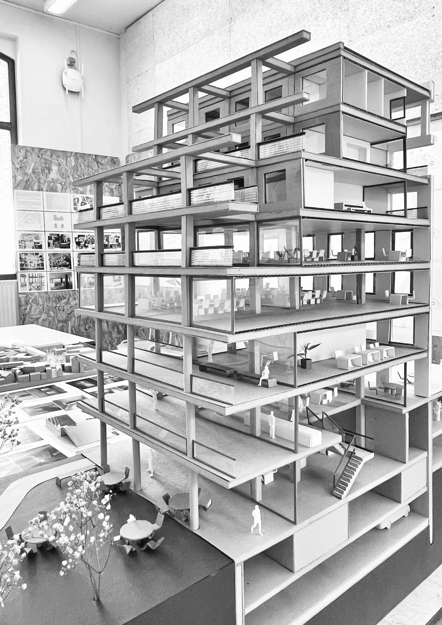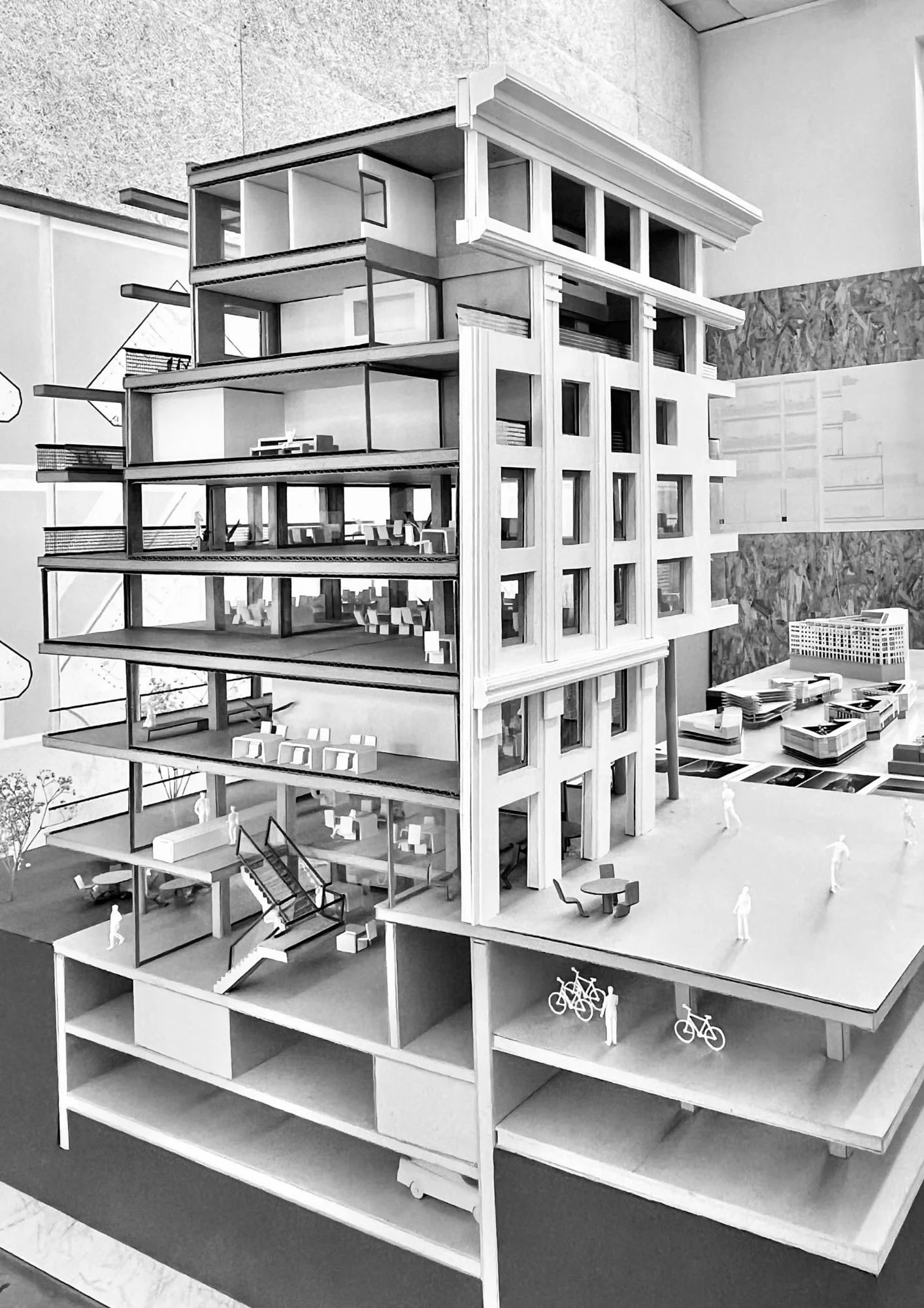 Le projet vise à requalifier un bâtiment post-moderne massif entièrement en béton, dont les plafonds bas et le manque de lumière naturelle en font aujourd’hui un volume introverti et peu perméable au tissu urbain.