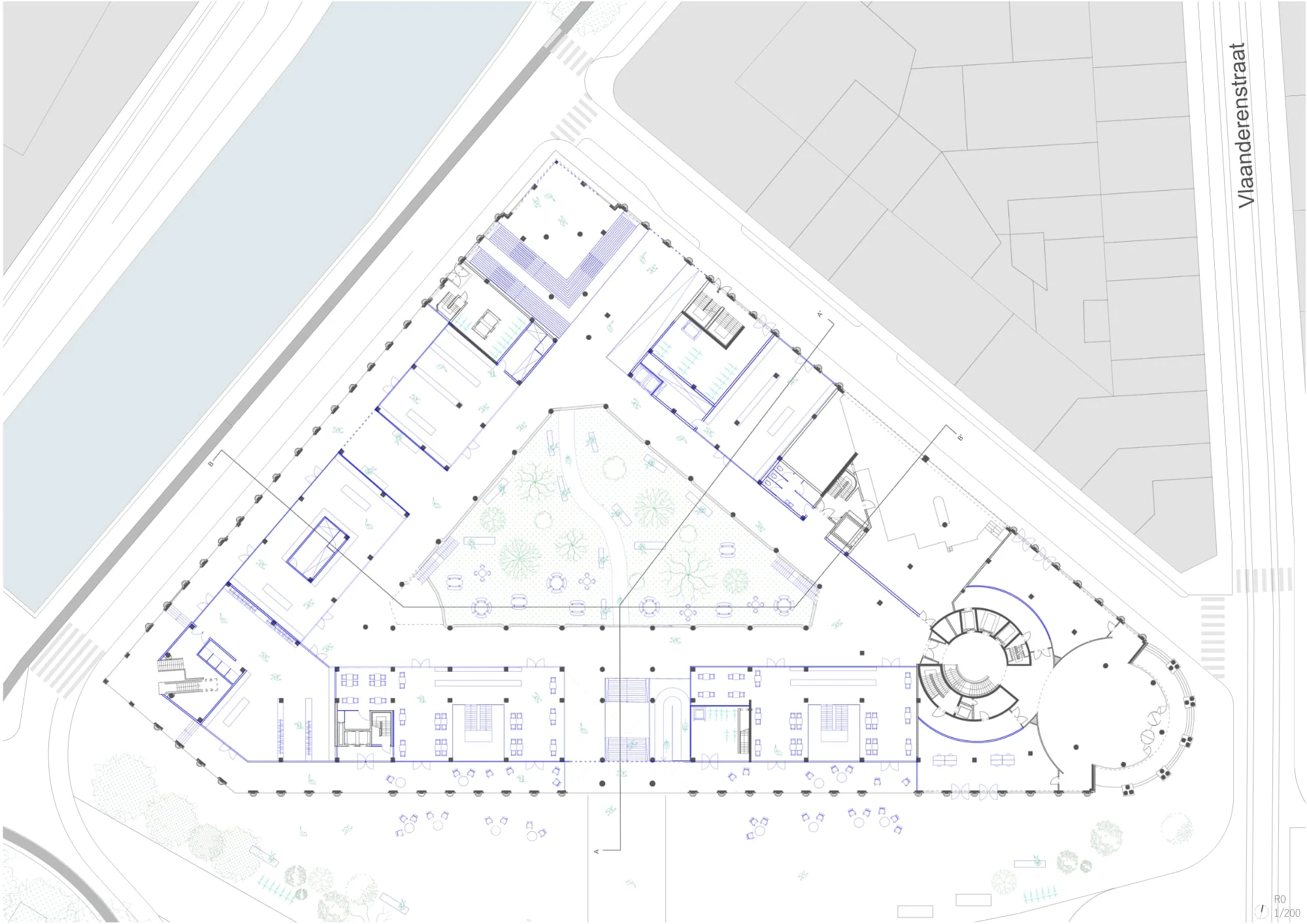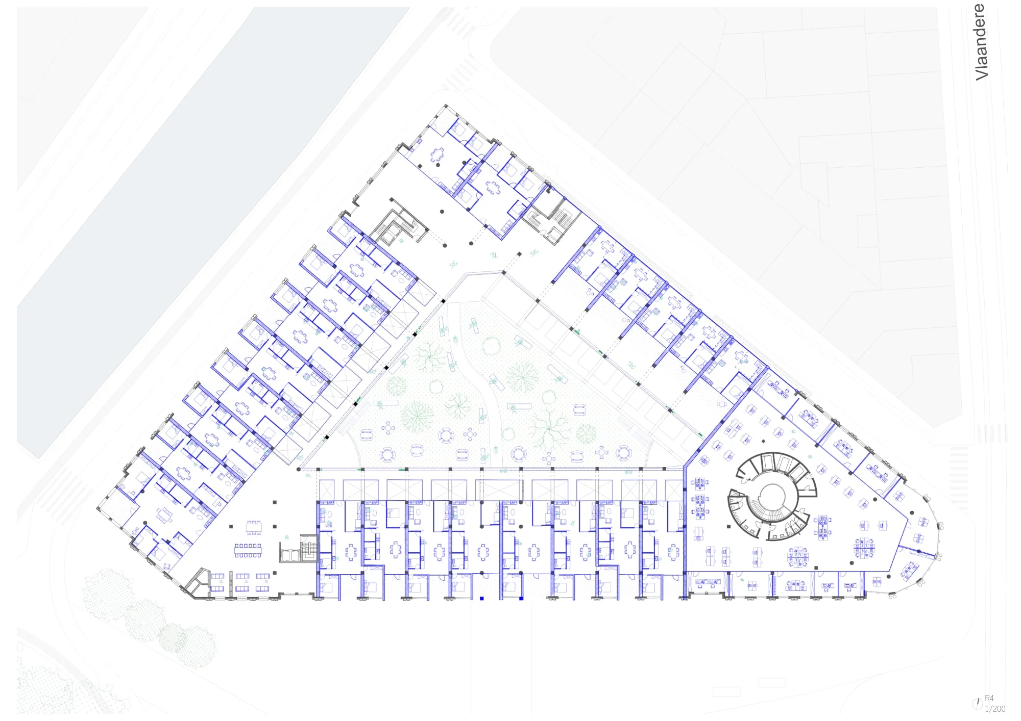 L’intervention cherche à transformer cette frontière en interface active en repensant les circulations intérieures, en simplifiant les façades et en rendant le rez-de-chaussée et le niveau -1 accessibles et ouverts vers la ville. Des percées dans les plateaux et les façades apportent lumière, vues, respirations spatiales et lisibilité des parcours, tout en s’appuyant sur une lecture précise des usages urbains de Gand. Un geste fort consiste à creuser jusqu’en pleine terre au niveau -1 afin d’introduire un jardin végétalisé, activant le cœur d’îlot, améliorant le microclimat et apportant une qualité d’habiter par la lumière, la ventilation naturelle et une biodiversité renforcée.